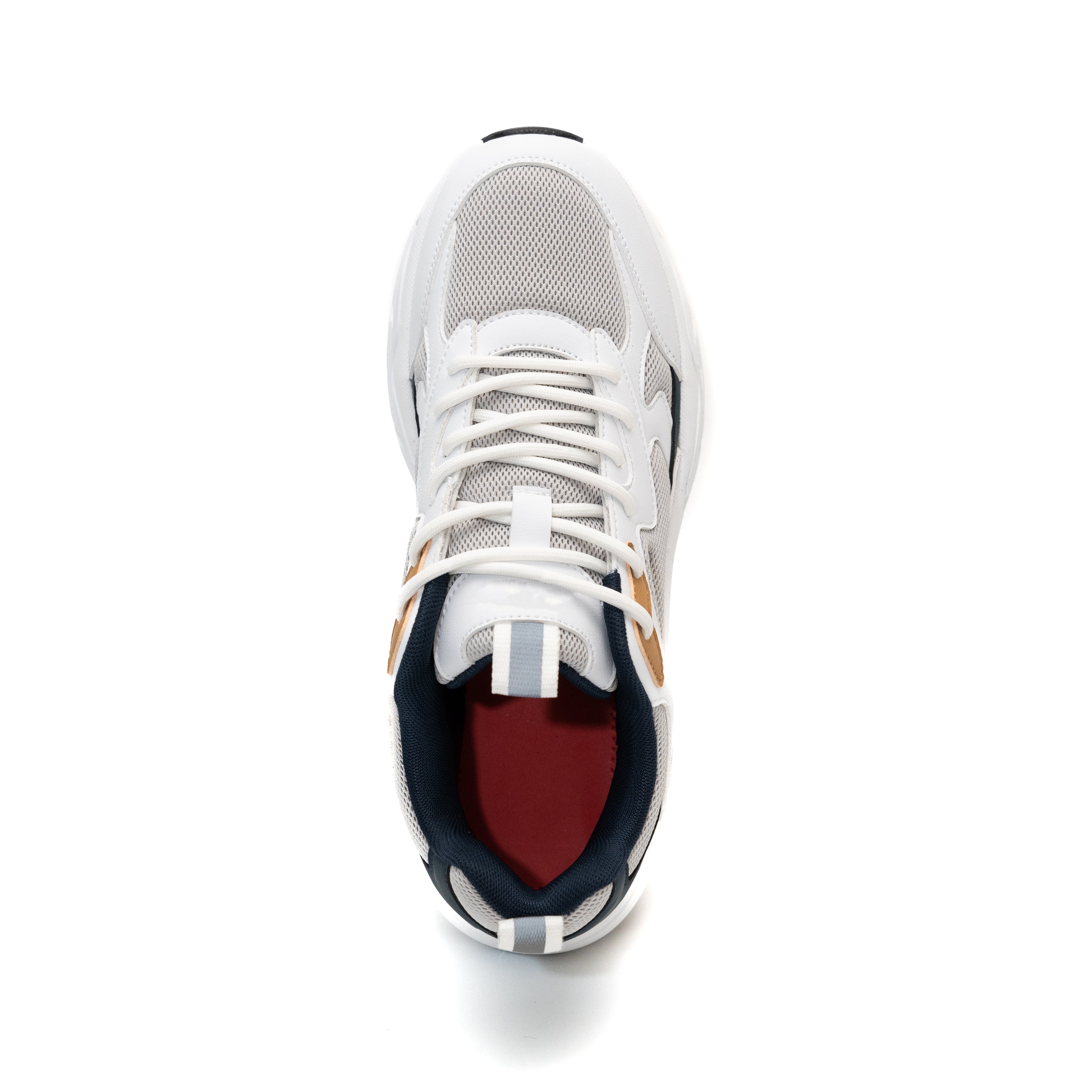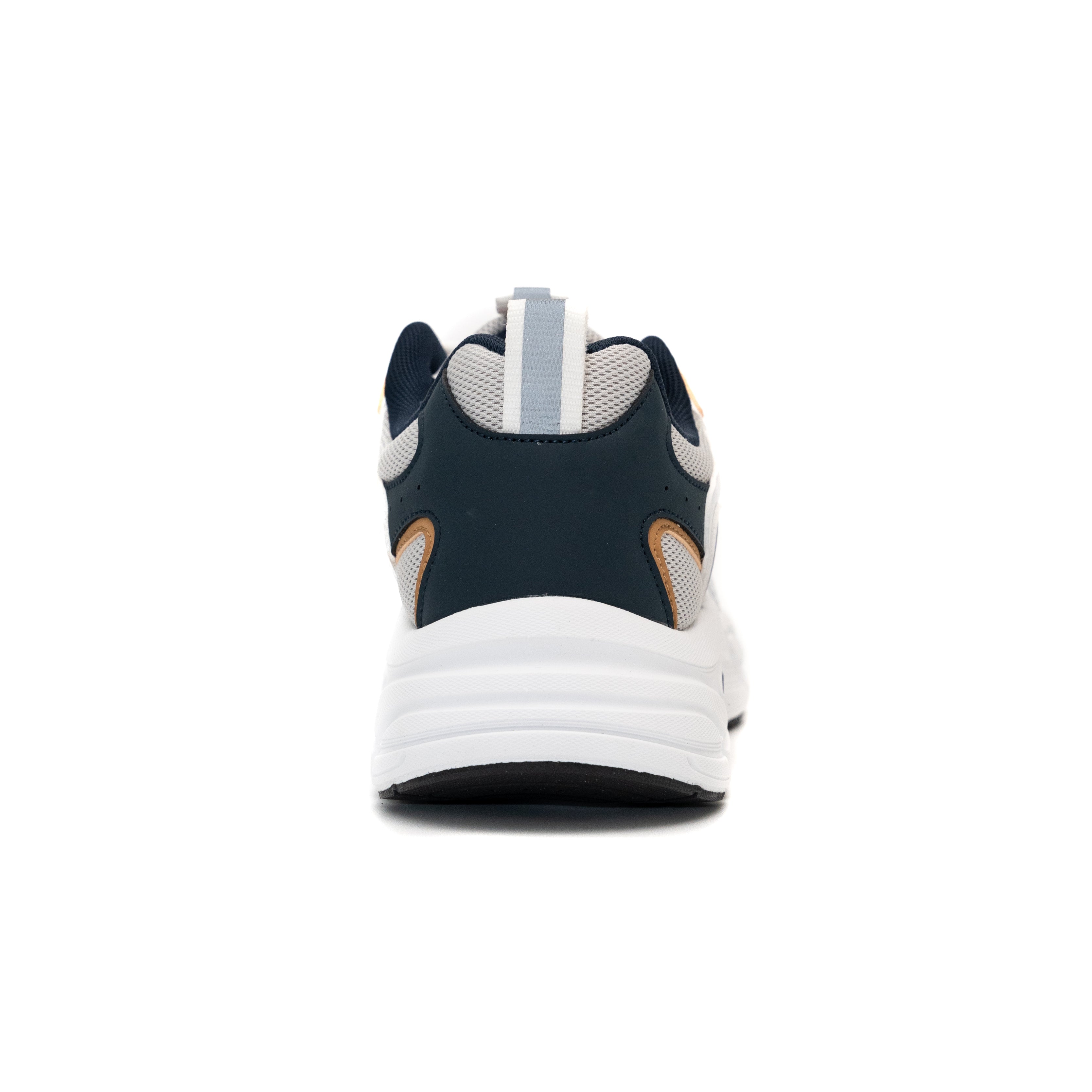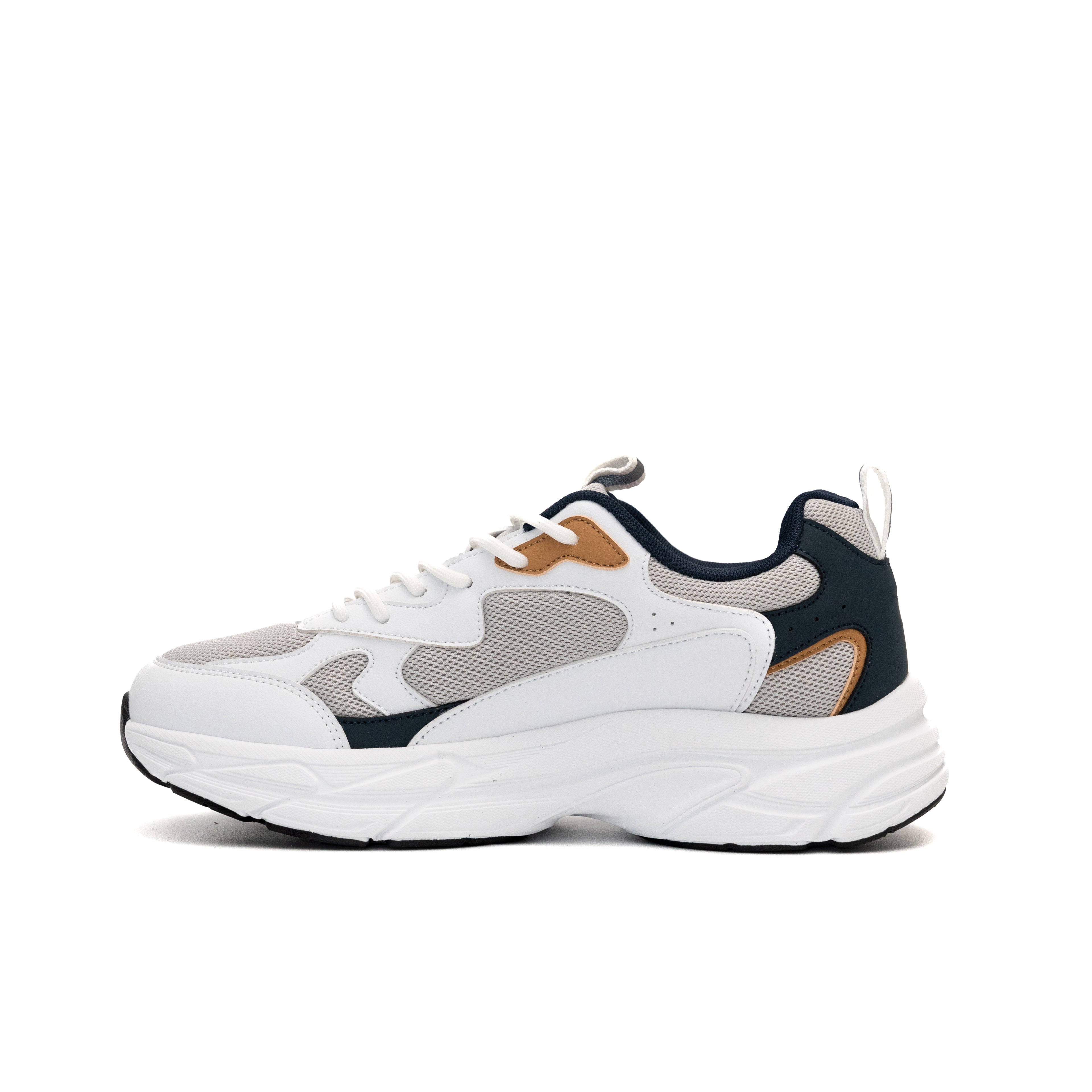 These modern chunky-sole sneakers blend streetwear style with functional design, featuring a predominantly white upper accented by navy blue, tan, and light gray tones for a bold yet versatile look. The upper combines breathable mesh panels (front/toe area and sides) with durable synthetic leather overlays (collar and structural sections), ensuring ventilation while maintaining structure.