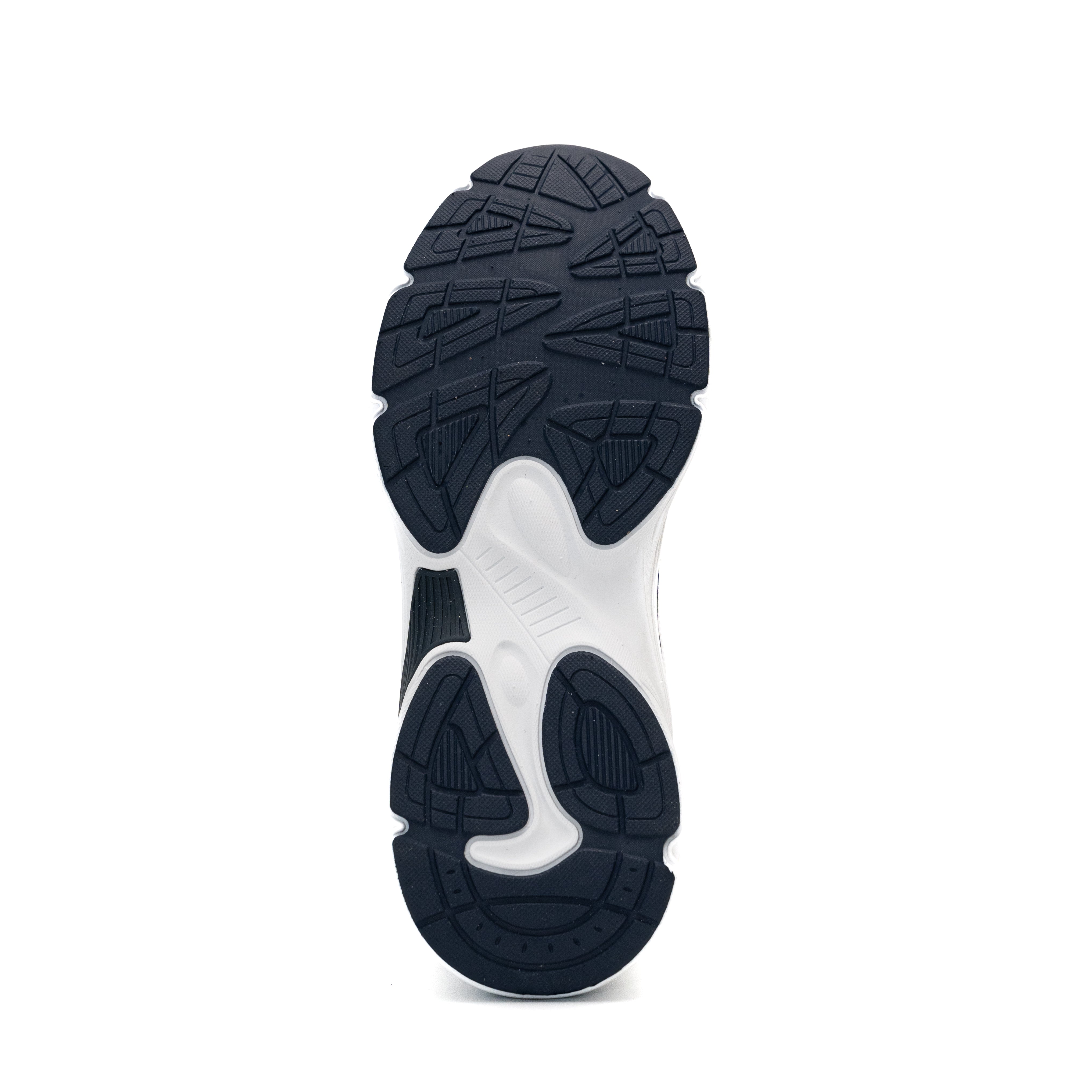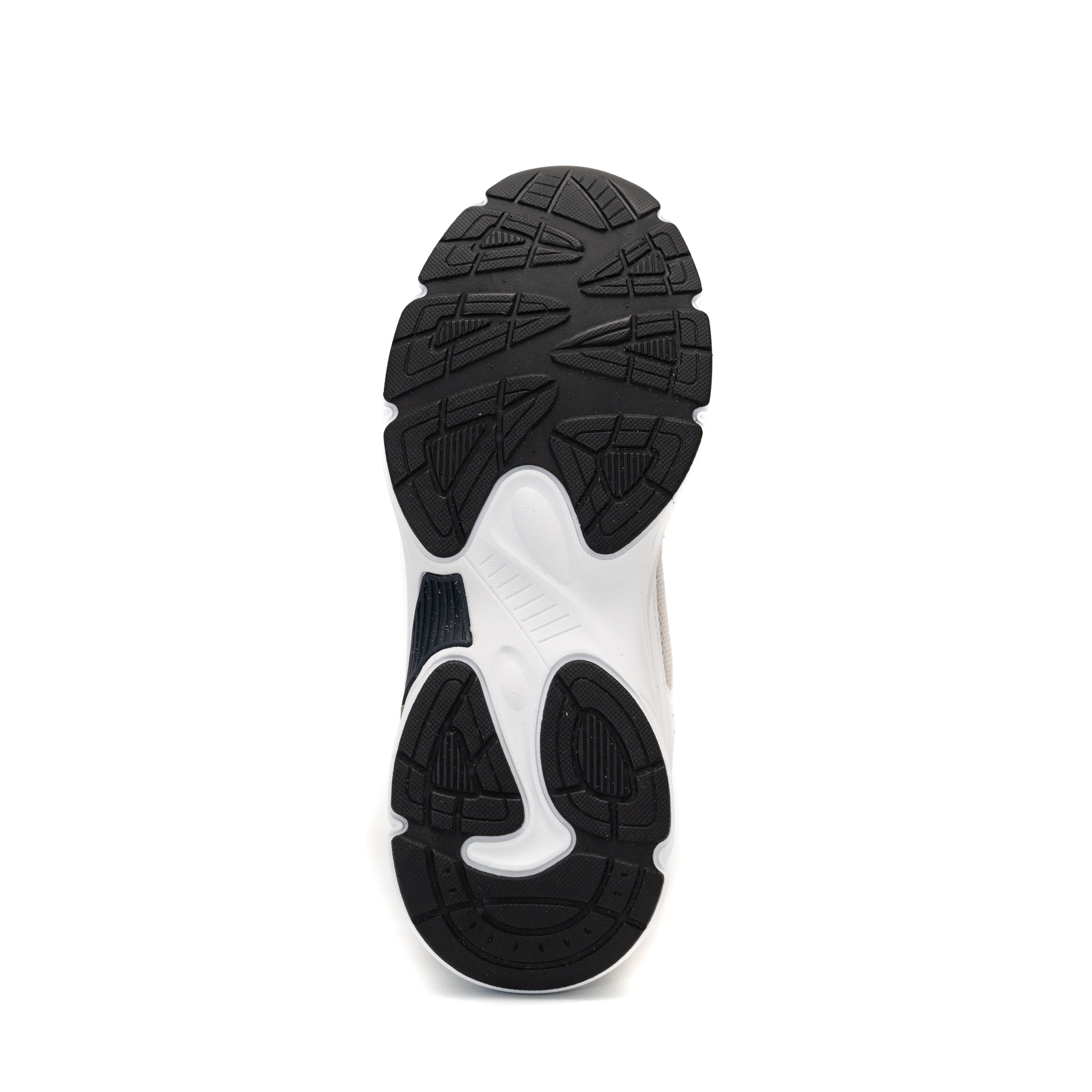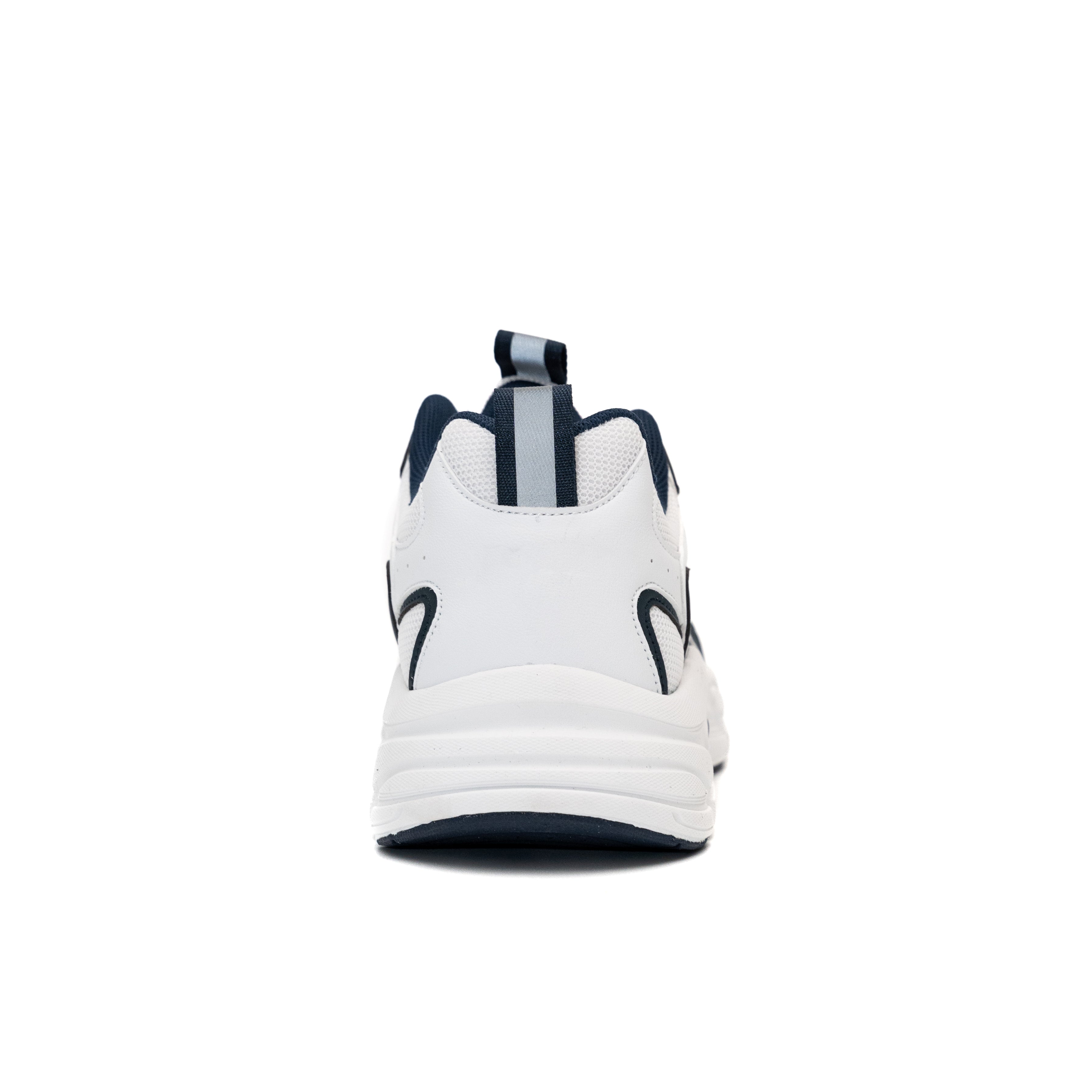 These modern chunky-sole sneakers blend streetwear style with functional design, featuring a predominantly white upper accented by navy blue, tan, and light gray tones for a bold yet versatile look. The upper combines breathable mesh panels (front/toe area and sides) with durable synthetic leather overlays (collar and structural sections), ensuring ventilation while maintaining structure.